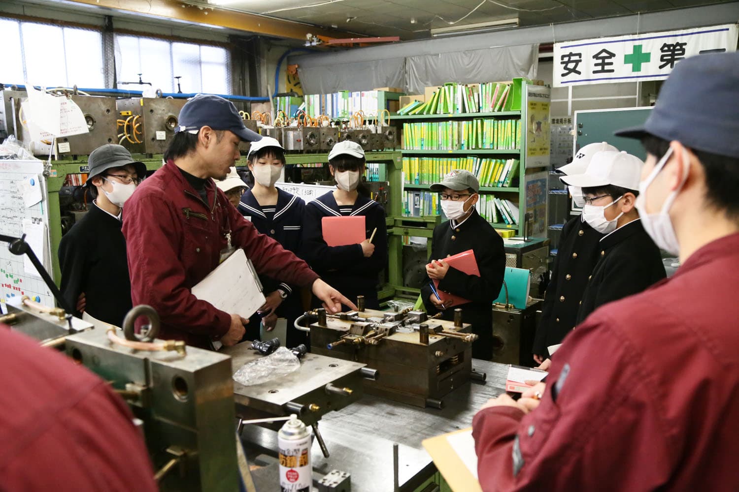 普段見ることのない”ものづくり”の裏側に、学生さんは興味津々の様子で金型を色々な角度から見たり、メモを取ったりしていました。