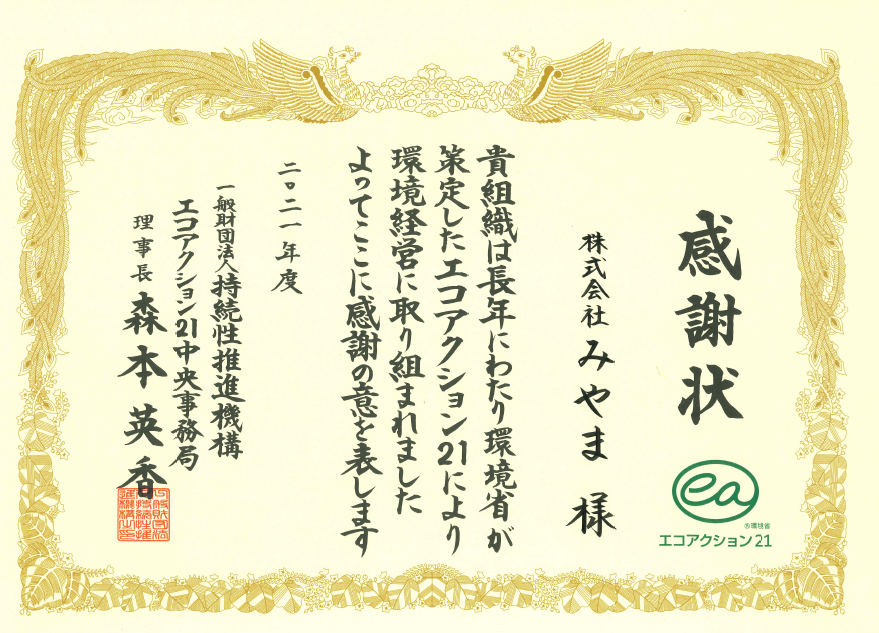 エコアクション21認証・登録永年継続事業者として感謝状をいただきました。